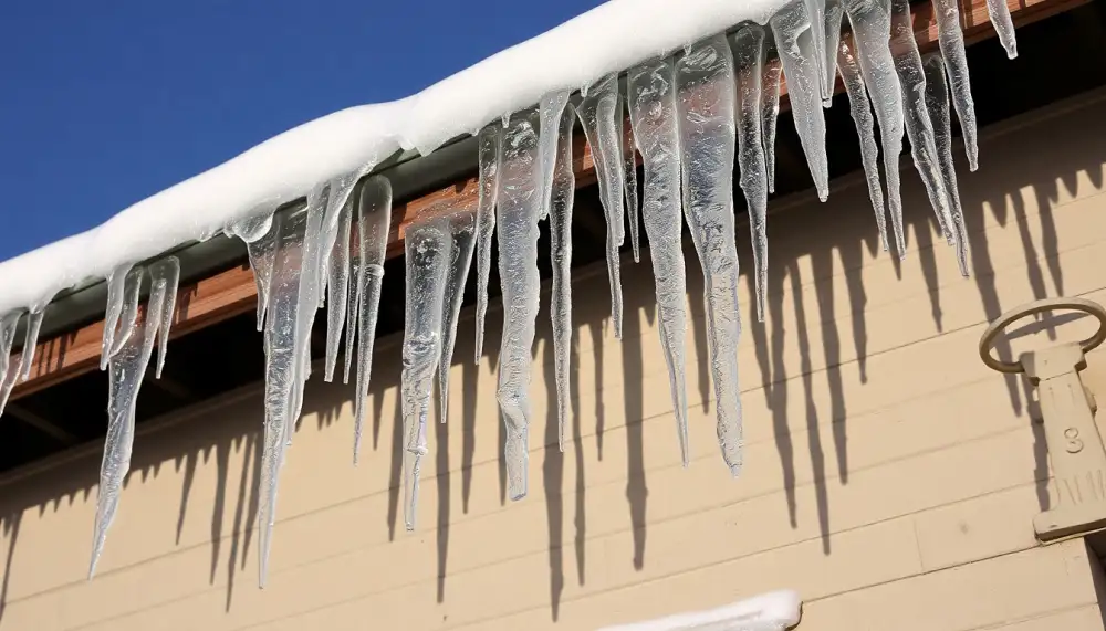 Nebo je střecha špatně izolovaná – teplo z domu taje sníh, voda stéká dolů a na okraji mrzne. Výsledek? Obrovské rampouchy.